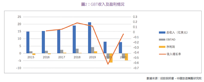 疫情前GBT收入逐年上升,受新冠疫情沖擊收入利潤大幅下滑,近期業(yè)績逐漸修復。2015-2019年GBT收入由14.88億美元增長至21.19億美元,連續(xù)兩年增速超10%,2019年總交易量(TTV)達到新高290億美元,較去年增長9.8%,從盈利情況看,GBT 在2017年實現(xiàn)扭虧為盈,凈利潤0.43億美元,2019 年凈利潤1.34億美元,凈利率由2.68%提升至6.32%。2020年受新冠疫情影響,收入下跌62.58%至7.93億元,EBITAD和凈利潤轉負,虧損6.18億美元。2021 年受收益率下降影響,總收入下降4%,雖仍未恢復盈利但較去年減虧1.43億美元。受國際旅行復蘇影響,2022年二季度GBT收入同比增長217%至4.86億美元,恢復至2019年的64%,凈虧損縮減為200萬美元。2022年上半年收入恢復至2019年同期的76%, 預計下半年交易業(yè)務復蘇將推動GBT收入恢復,全年交易量將恢復到2019年的74%,全年收入預期達到18.5億美元。