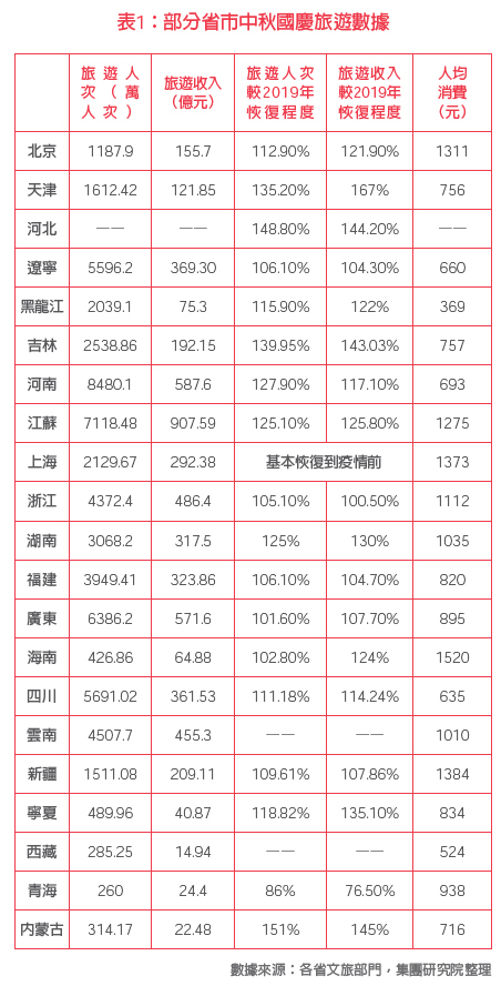 從國內(nèi)旅游市場看,接待人次和旅游收入均較疫情前實現(xiàn)同比增長,但較預(yù)測數(shù)據(jù)有差距。據(jù)文化和旅游部數(shù)據(jù)中心測算,中秋、國慶節(jié)假日八天,國內(nèi)旅游出游人數(shù)8.26億人次,按可比口徑同比增長71.3%,按可比口徑較2019年增長4.1%;實現(xiàn)國內(nèi)旅游收入7534.3億元,按可比口徑同比增長129.5%,按可比口徑較2019年增長1.5%。但兩項數(shù)據(jù)都低于文旅部9月30日的預(yù)測, 預(yù)測值為出游人次8.96億,國內(nèi)旅游收入7825億元。