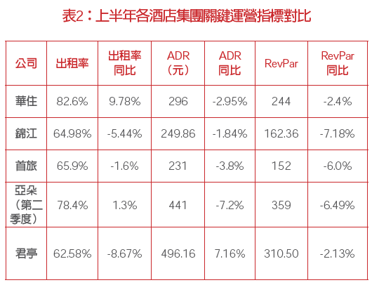 受上半年宏觀消費(fèi)以及去年高基數(shù)影響,上半年各大酒店集團(tuán)出租率表現(xiàn)分化,RevPAR、ADR則普遍出現(xiàn)下滑。上半年,受宏觀經(jīng)濟(jì)不確定以及消費(fèi)者信心不足等因素影響,商旅需求方面,差旅預(yù)算收緊,商務(wù)差旅活動(dòng)更多集中在中心城市。旅游需求方面,消費(fèi)信心下滑,酒店行業(yè)面臨消費(fèi)分級(jí)的壓力,此外,二季度開始極端天氣明顯,出行減少。從出租率來(lái)看,華住和亞朵酒店保持了正增長(zhǎng),分別同比增長(zhǎng)9.78個(gè)百分點(diǎn)和1.3個(gè)百分點(diǎn);錦江同比下降5.44個(gè)百分點(diǎn),首旅則微降1.6個(gè)百分點(diǎn),君亭酒店下降8.67個(gè)百分點(diǎn)。從平均房?jī)r(jià)和間房收益來(lái)看,亞朵和君亭酒店作為中高端酒店的代表,其平均房?jī)r(jià)和間房收益明顯高于華住、錦江和首旅酒店,但從同比來(lái)看,受整體宏觀環(huán)境及惡劣天氣影響,亞朵和君亭酒店的同比降幅也較大,其中君亭酒店旗下新安江景瀾酒店遭受的持續(xù)大雨和洪澇災(zāi)害致使酒店停業(yè)抗災(zāi)長(zhǎng)達(dá)半月之久。華住集團(tuán)預(yù)計(jì)今年7、8兩月暑期數(shù)據(jù)將同比下降10%左右。