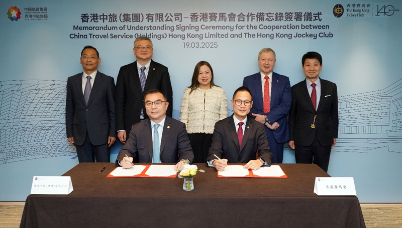 3月19日,集團與香港賽馬會在跑馬地馬場簽署合作備忘錄,推動賽馬旅游合作。香港特區(qū)政府文化體育及旅游局局長羅淑佩、中聯(lián)辦經(jīng)濟部副部長郭韶偉、香港旅游發(fā)展局主席彭耀佳、集團董事長王海民、馬會行政總裁應(yīng)家柏出席見證。集團副總經(jīng)理簡易與馬會客戶策略、體驗及創(chuàng)新事務(wù)執(zhí)行總監(jiān)侯德洋代表雙方簽約。