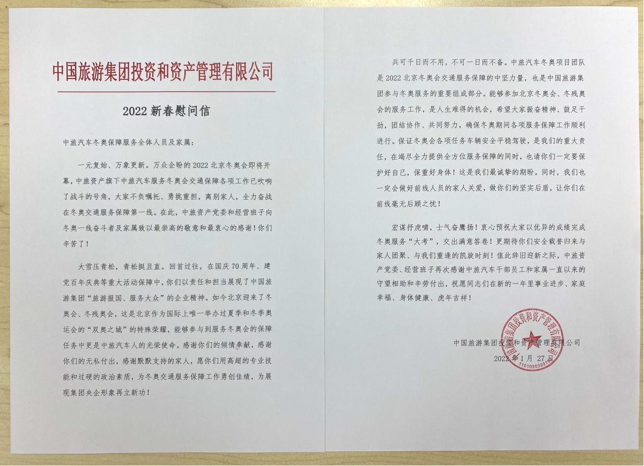 中旅資產(chǎn)近日向中旅汽車冬奧交通服務(wù)保障全體人員及家屬發(fā)出“致冬奧奮斗者新春慰問信”。