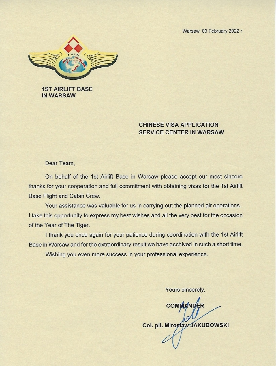 2月17日,執(zhí)飛波蘭總統(tǒng)杜達(dá)訪華專機(jī)的波蘭空軍一號(hào)基地專門派員向中旅旅行所屬華沙中國(guó)簽證申請(qǐng)服務(wù)中心(以下簡(jiǎn)稱“華沙簽證中心”),送來該基地總司令Miroslaw JAKUBOWSKI將軍署名的感謝信,這是中旅旅行所屬境外簽證中心收到的第26封關(guān)于保障冬奧會(huì)的感謝信。