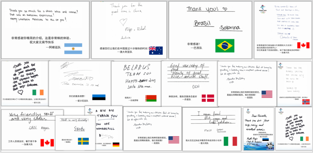 北京冬奧開村以來,中旅冬奧服務團隊陸續(xù)收到來自美國、加拿大、俄羅斯、法國、意大利、瑞典等國代表團的感謝信。信中對中旅團隊提供的熱情、細致、專業(yè)的服務予以肯定,并對工作人員表示衷心感謝。有關感謝信表示,“住宿和餐飲的感受能夠直接影響遠道而來的外國友人對于冬奧會乃至對中國的整體感觀。中國人都講賓至如歸,正是你們細致周到的服務,促進了冬奧會的順利舉辦,也讓大家感受中國的大國風采?!眮碜悦绹韴F的官方感謝信信中提及,在2月9日至10日美國隊運動員大范圍轉(zhuǎn)場這一最復雜的過渡期,中旅服務人員超越期待,及時完成了房間打掃和清理,讓新入村的人員感到很受歡迎。