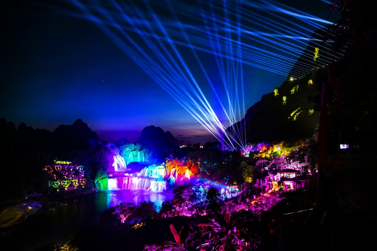 景區(qū)傾力打造亞洲首個沉浸式跨國夜游互動體驗項目--“奇妙?夜德天”,游客可從高空棧道俯瞰德天瀑布夜景,欣賞璀璨燈光下瀑布的磅礴氣勢,也能近距離感受燈光與水幕的完美交融,獲得身臨其境的體驗,實現(xiàn)“一夜德天,一瀑兩國”的沉浸式體驗。